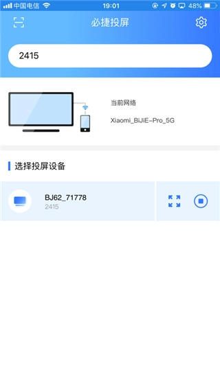 2、启动“必捷投屏”应用,系统会自动搜索可用的投屏设备,只要设备处于同一局域网环境下就能完成连接。