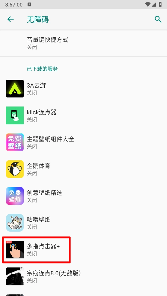 3、跳转至"无障碍"页面打开"多指点击器"。
