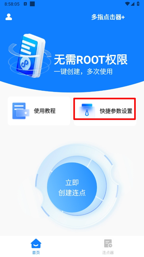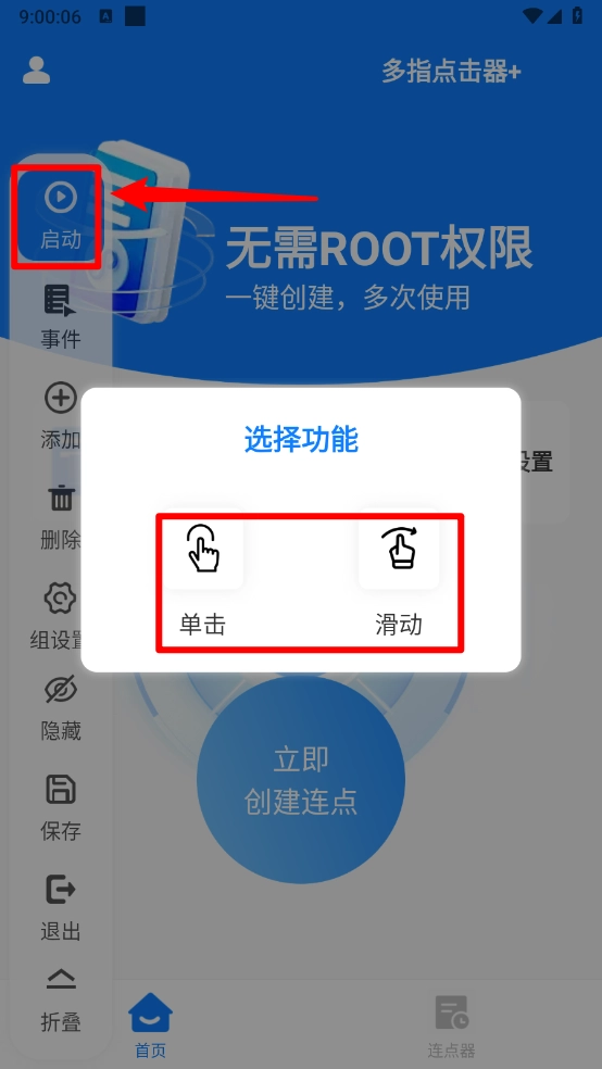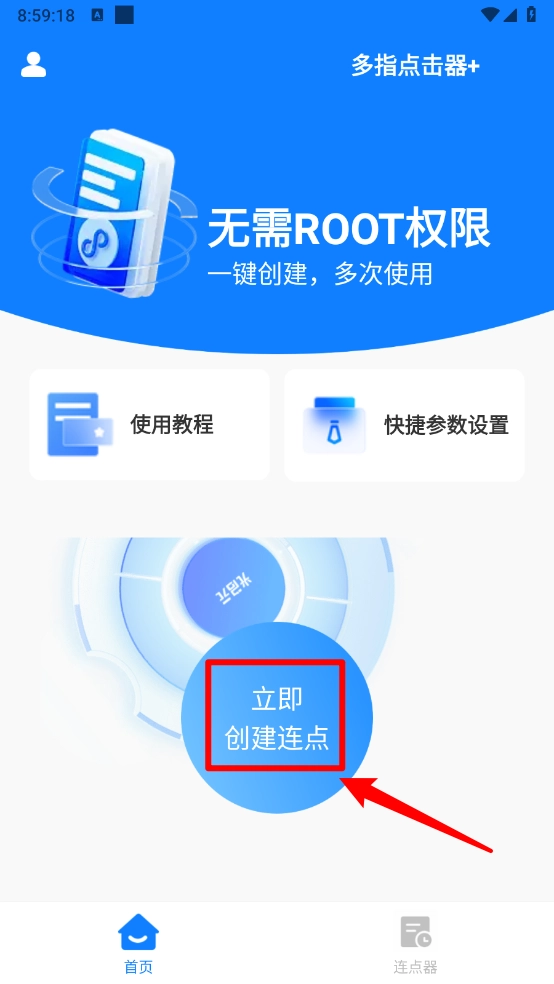1、创建连点功能:支持用户自行设置点击的具体位置、点击的频率以及触控的点数,同时提供由用户主动触发的点击模式。