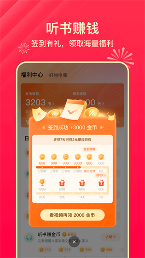 3、【福利多多】海量红包、新人见面礼、听歌听书专属福利,每日福利享不停,提现秒到账,随时随地轻松领!