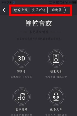 4、进入音效设置界面后,可选择“蝰蛇音效全景环绕”,也可以对“均衡器”进行调节。