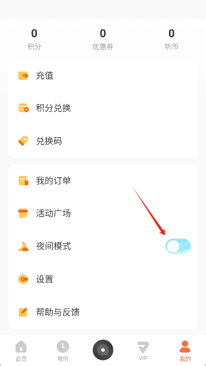 2、在我的页面中找到并点击“夜间模式”滑块。