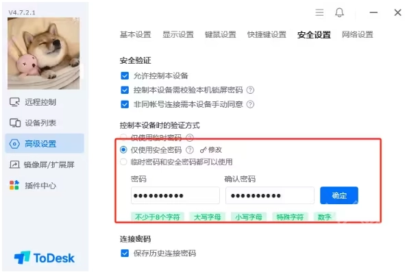 若希望设置固定密码以便后续再次进行远控连接,可前往高级设置页面,找到安全设置里的安全密码选项进行修改。