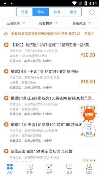 在标准大厅里,能看到代练的订单,找到合适的就可以接下。