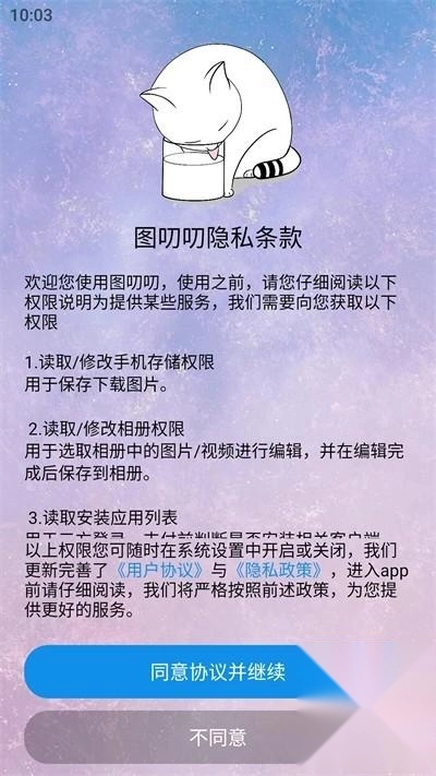 1、首先打开图叨叨应用,进入软件后会弹出隐私条款,需要用户进行同意操作。