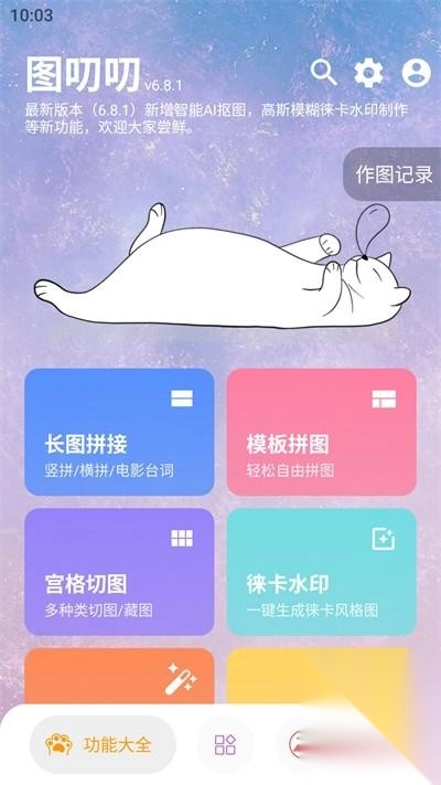 2、接着进入软件首页,在这个页面能够开展图片的长图拼接、模板拼图、宫格切图以及添加徕卡水印等操作。