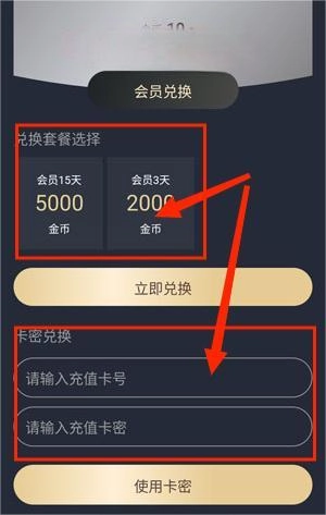 3.您可以在会员界面通过消耗金币兑换会员权益,也可以使用卡密来兑换会员资格。