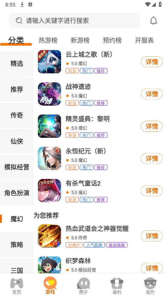2、首页与游戏页面汇集了海量游戏资源,涵盖三国、传奇、仙侠等多种类型。