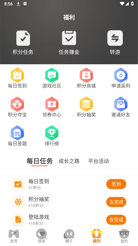 6、进入“福利”页面后,可通过完成每日任务、参与成长之路活动以及平台推出的各类活动来获取积分。
