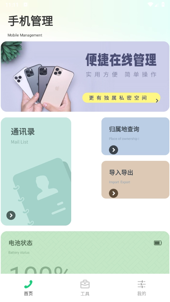 2、进入首页后,呈现的主要是手机管理相关的各类工具,像通讯录、号码归属地查询等功能都包含在内。