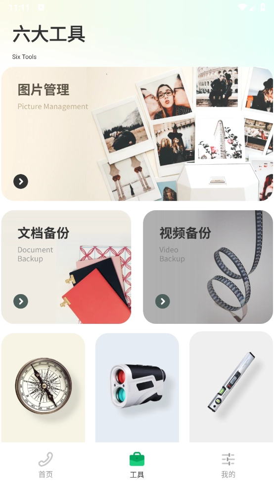 3、“工具”页面集成了多种实用小工具,像指南针、测距仪和文档备份功能等都涵盖其中。