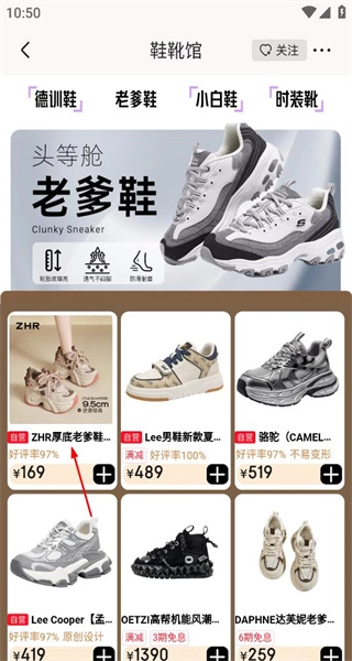 2、切换到老爹鞋分类页面,这里会展示头等舱老爹鞋以及多款相关商品,你可以查看每款鞋子的价格和优惠信息。