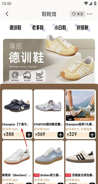 打开软件后进入德训鞋分类页面,这里会展示薄底德训鞋以及多款相关联的商品,你可以查看每款鞋子的价格和好评率。