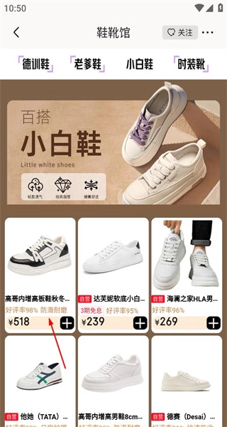 3、进入小白鞋分类页面,这里会呈现百搭小白鞋以及多款相关商品,你可以查看每款鞋子的价格和特色。