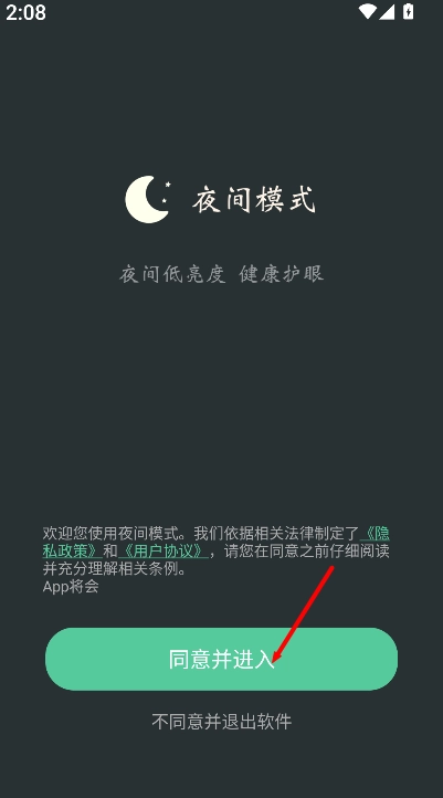 1、第一次进入《夜间模式》时,点击“同意并进入”就能完成初始设置,迅速进入功能页面。