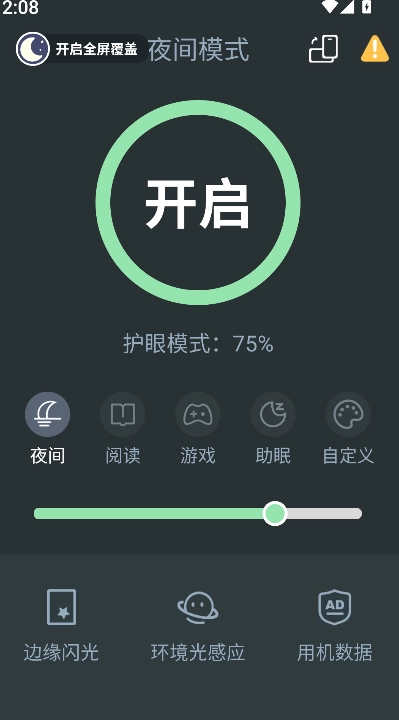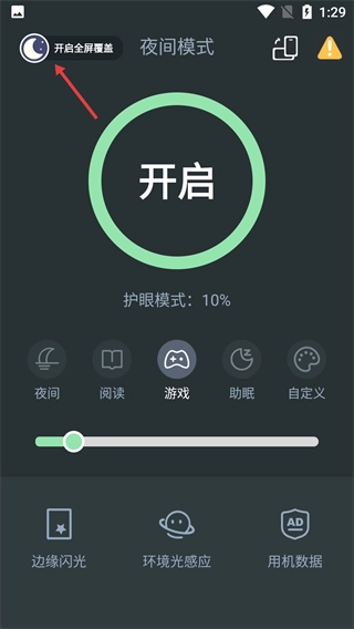 2、在主界面里,能够直接开启夜间模式,开启后屏幕的亮度和色温会自动调节到适合夜间使用的状态。