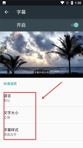 4、开启字幕功能后,能在当前界面调整“语言”“文字大小”“字幕样式”等参数,对字幕的显示效果进行自定义设置。