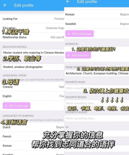 1、资料填报要求很详细(无需审核)。虽说过程有些繁琐,但这样反而能让我和外国友人更深入地互相了解。像我这样真诚的用户,真的特别喜欢这种设置。