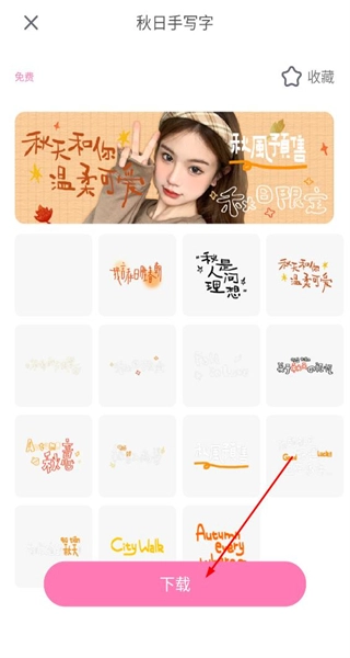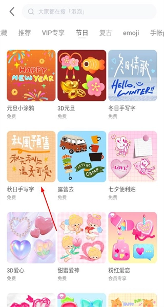 3、在节日类贴纸列表中找到秋日手写字贴纸选项,点击该选项进入对应的贴纸详情页面。
