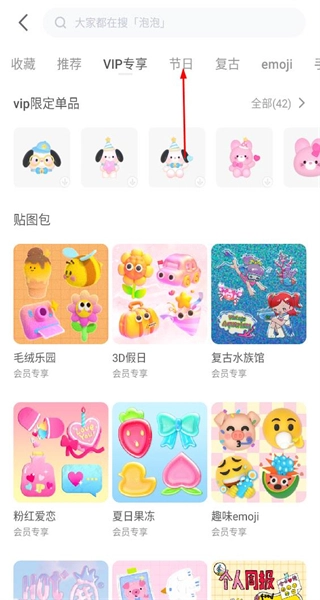 2、进入贴纸页面,看到多个分类标签,找到节日标签,点击该标签切换到节日类贴纸的展示列表。