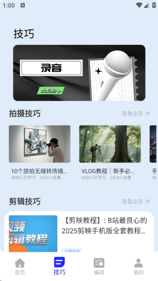 3、在技巧页面中可以了解拍摄技巧和剪辑技巧等功能;