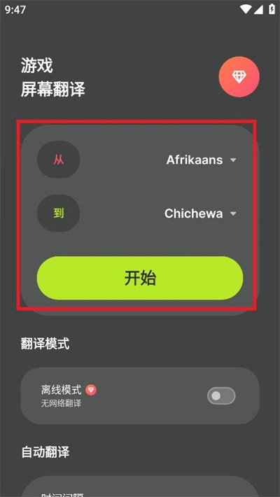 1. 你能够对语言的翻译类型进行设置,设置好之后点击开始按钮就行。