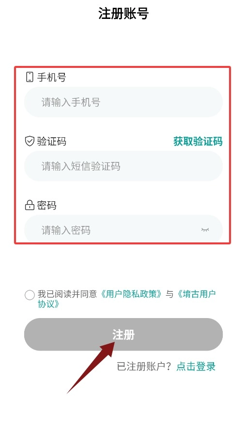 3、进入注册页面后,依次填写手机号、输入验证码并设置密码,就能完成注册流程。
