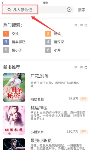 4、搜索凡人修仙记,或点击热门标签。