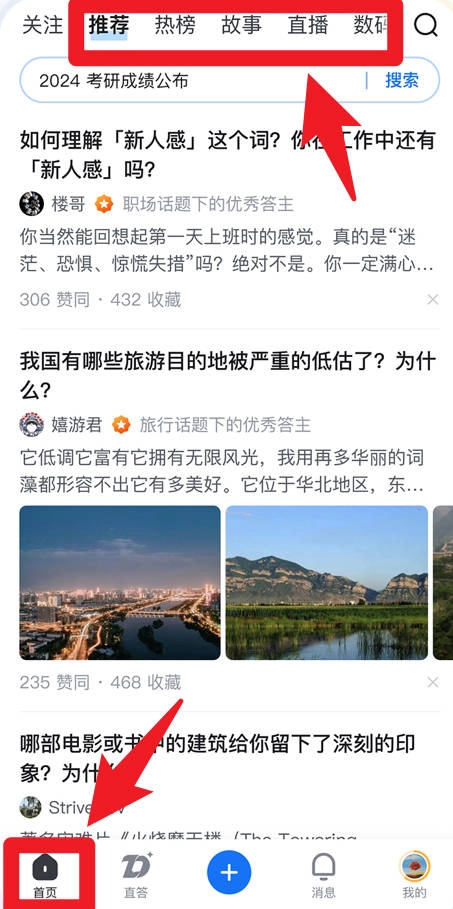 1、在首页区域,用户能够查看推荐、热榜、故事及直播等类别的内容,便捷地发现自己感兴趣的提问和回答。