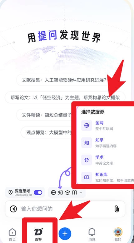 2、在直答界面,用户可以选择全网、知乎、学术、知识库等不同的数据源来提问,从而快速得到全面且精准的答案。