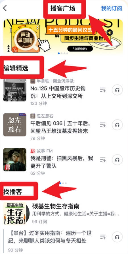 3、在播客广场,用户既能浏览编辑精心挑选的内容,也能借助找播客的功能订阅并收听更多优质音频节目,从而丰富日常的学习生活。