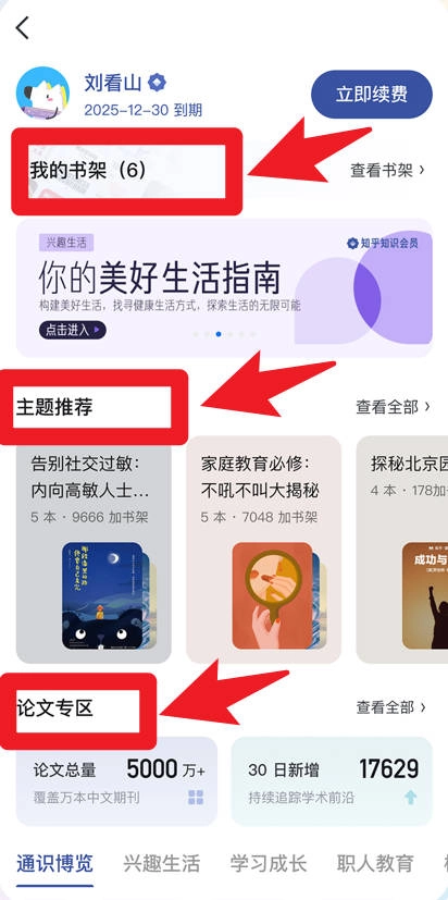 5、在个人主页上,用户可以进入我的书架,浏览主题推荐和论文专区,系统会依据用户的兴趣偏好,为其推荐契合的书籍及学术资料。