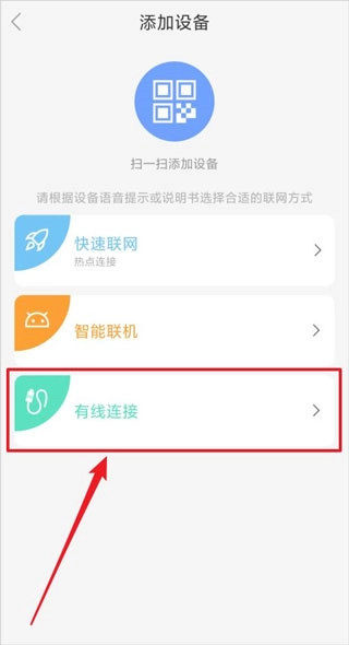 2、在“添加设备”页面,点击“有线连接”的方式,找到已购买的有线产品设备。