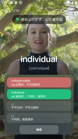 例句精准对应单词释义,能帮助理解常用语境,并且支持跟读打分功能
