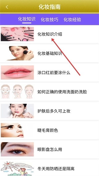 3、在化妆指南页面挑选具体的知识类别(例如【化妆知识】),点击相应的文章标题就能进入详情页面。