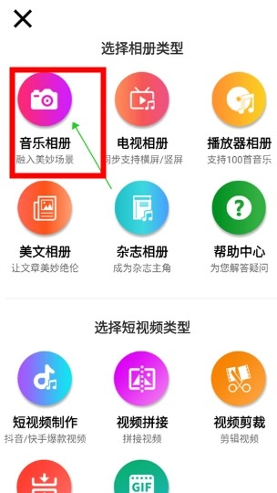 在功能菜单中找到“音乐相册”并点击。
