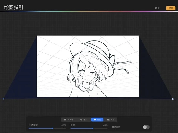 「绘图指引」功能支持配置多种辅助线样式,包括平行网格、等边三角形格线、透视线和对称轴线等。当在图层操作菜单中启用「绘图辅助」后,在对应图层绘制时,画笔轨迹会自动贴合所选网格的方向。