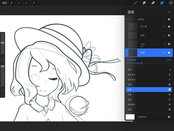 这里补充说明一下,文中提到的「N」代表当前图层采用的是「正常」混合模式。我偶尔会把勾线图层的混合模式调整为「强光」,这样底稿的线条就能在勾线过程中清晰显示出来。在图层的编辑菜单里,你可以对当前选中的图层进行混合模式的修改,这些选项和多数专业图像处理软件里的图层特效大同小异。要是你想深入了解这些混合模式各自的具体作用,建议查阅Procreate官方文档中关于「混合模式」的详细说明。